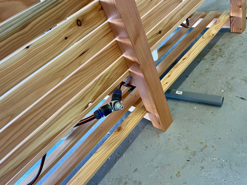 Die kleine Küche ist aus heimischer Douglasie gefertigt und wasserabweisend gewachst. Das Wasser kommt über einen Gartenschlauch in die Hähne und der Abfluss kann beliebig verlängert werden.