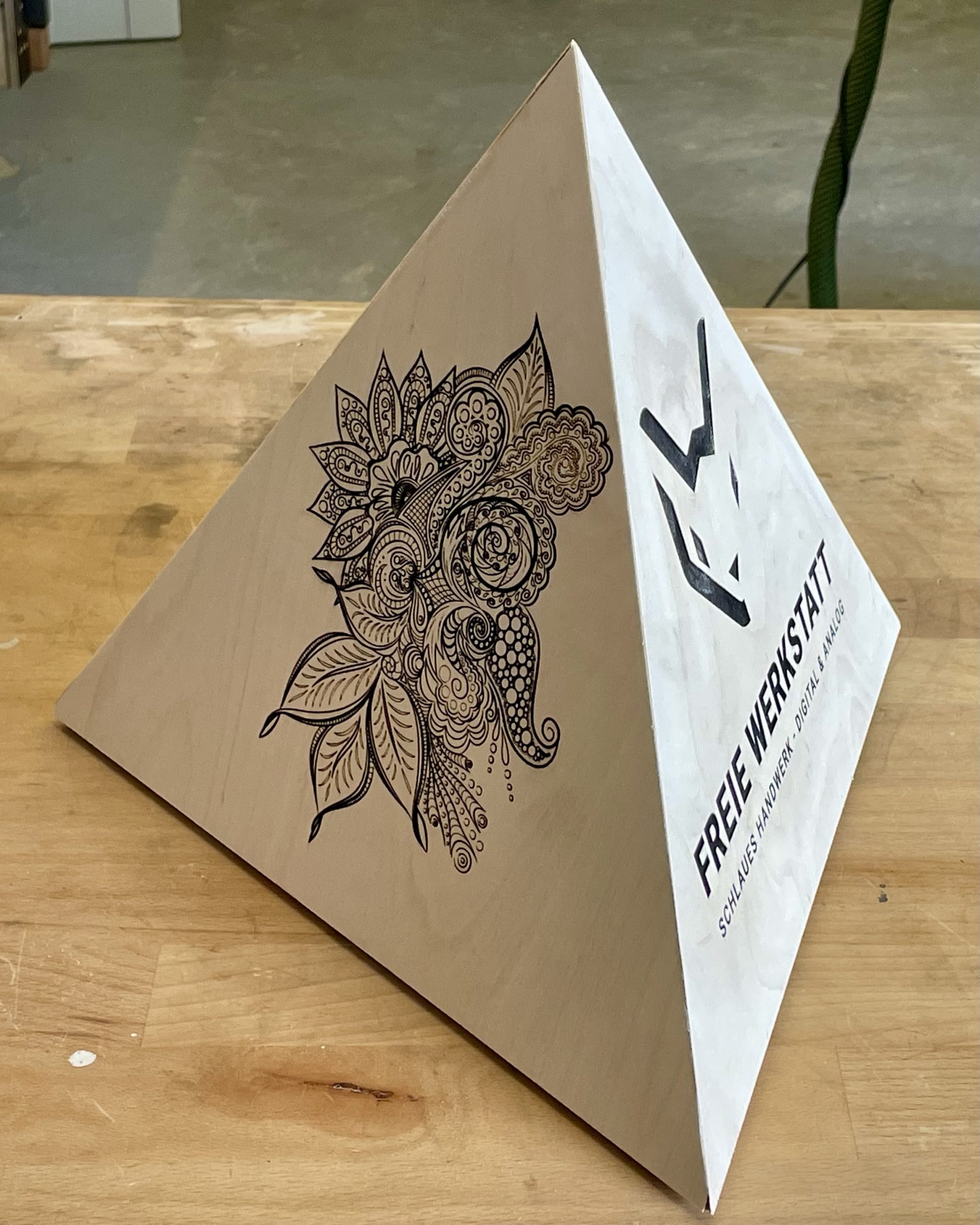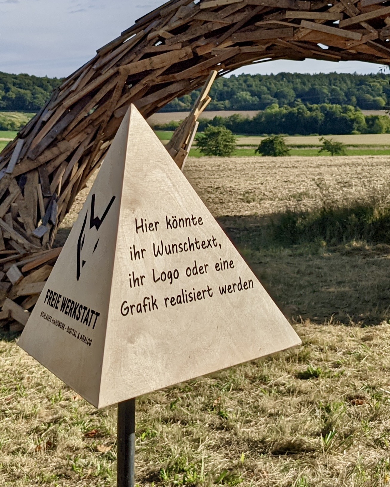 Die InfoPyramid ist mehr als ein Schild – sie ist ein echter Blickfang. Gefertigt aus hochwertigem Birke-Multiplex, vereint sie klare Formensprache mit individueller Gestaltung. Drei Seiten stehen für deine Botschaft bereit und lassen sich mit Lasergravur millimetergenau nach Wunsch beschriften oder verzieren – vom Logo bis zu filigranen Grafiken.