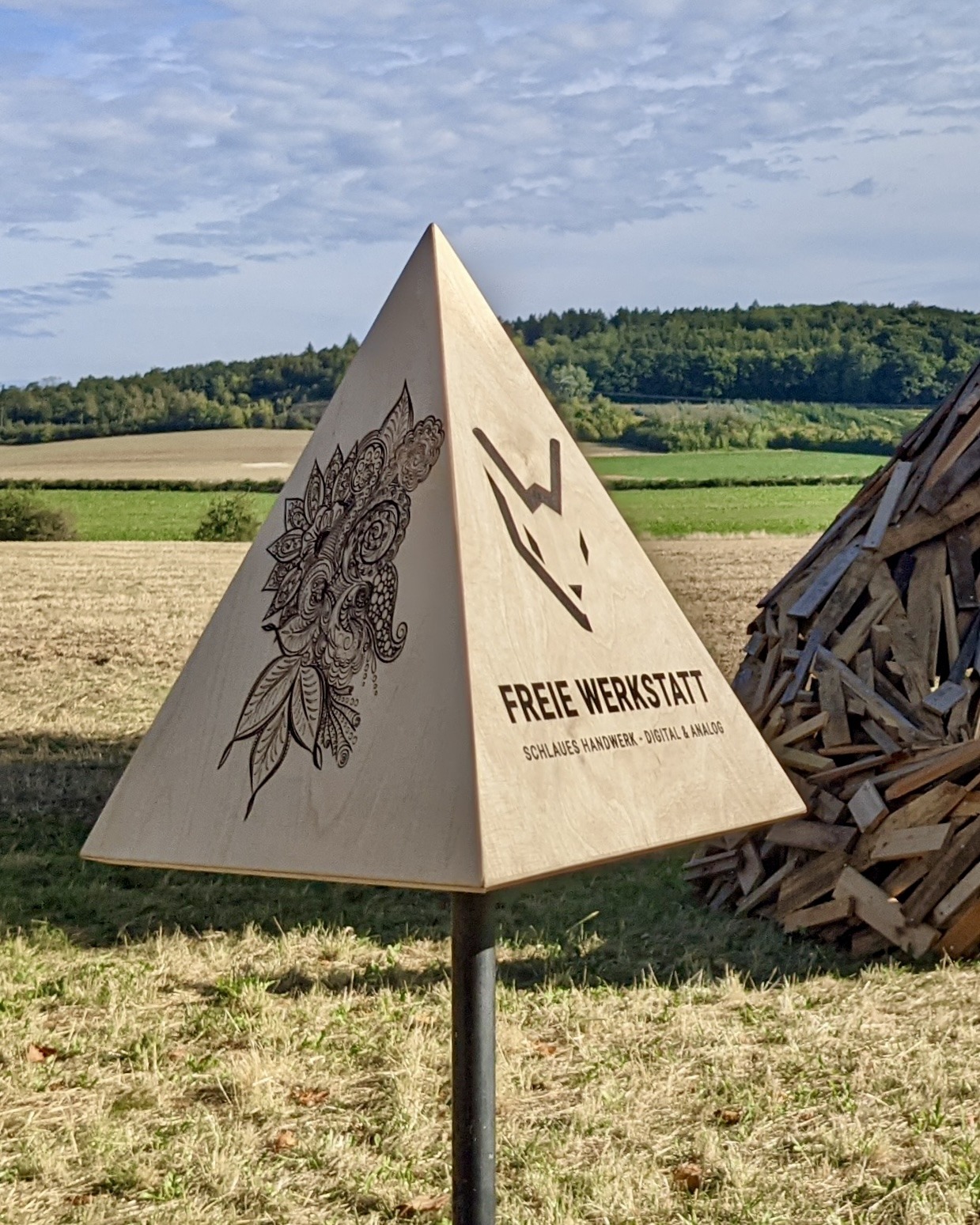 Ob als Infopoint bei Kunstprojekten, als Orientierungshilfe im Außenbereich oder als repräsentatives Firmenschild: Die pyramidenförmige Konstruktion zieht Aufmerksamkeit auf sich und macht Informationen sichtbar, ohne aufdringlich zu wirken.